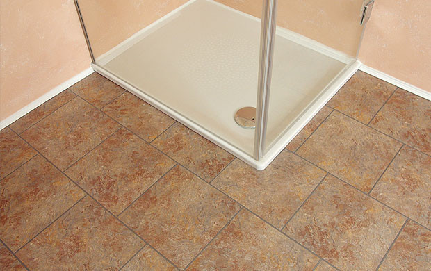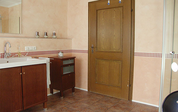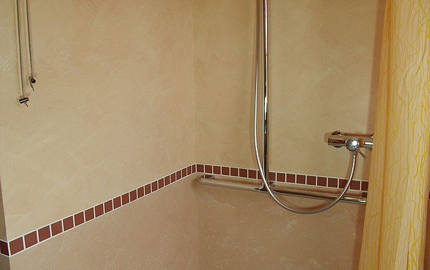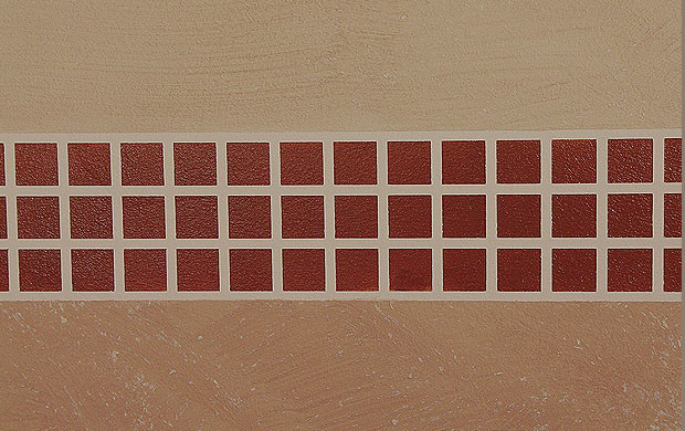 Dunkle Fliesen gespachtelt und farbig gestrichen, Dekorband eingearbeitet Boden: Expona Domestik